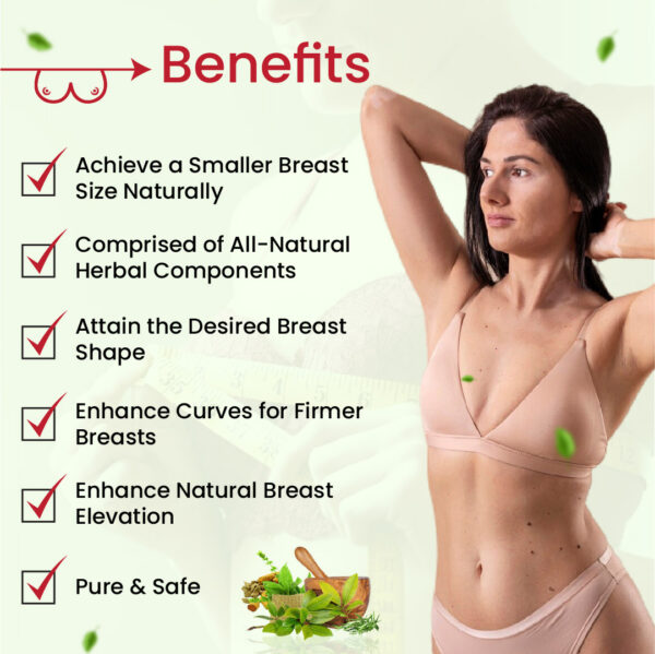 Breast reducing capsule and cream are 100% herbal, safe and most important have no side effects. You don’t have to worry about side effects and dangers. This medicine balances estrogen levels and hinders sagging to reduce breast size. After taking this medicine you will be comfortable healthier and younger looking cleavage.